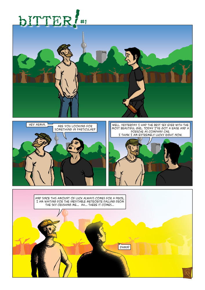 And thus it begins. The first in a hopefully long running series of bITTER!-comics. And like a lot of good series it starts off with a glimpse of the end. I thought it is funny. No?