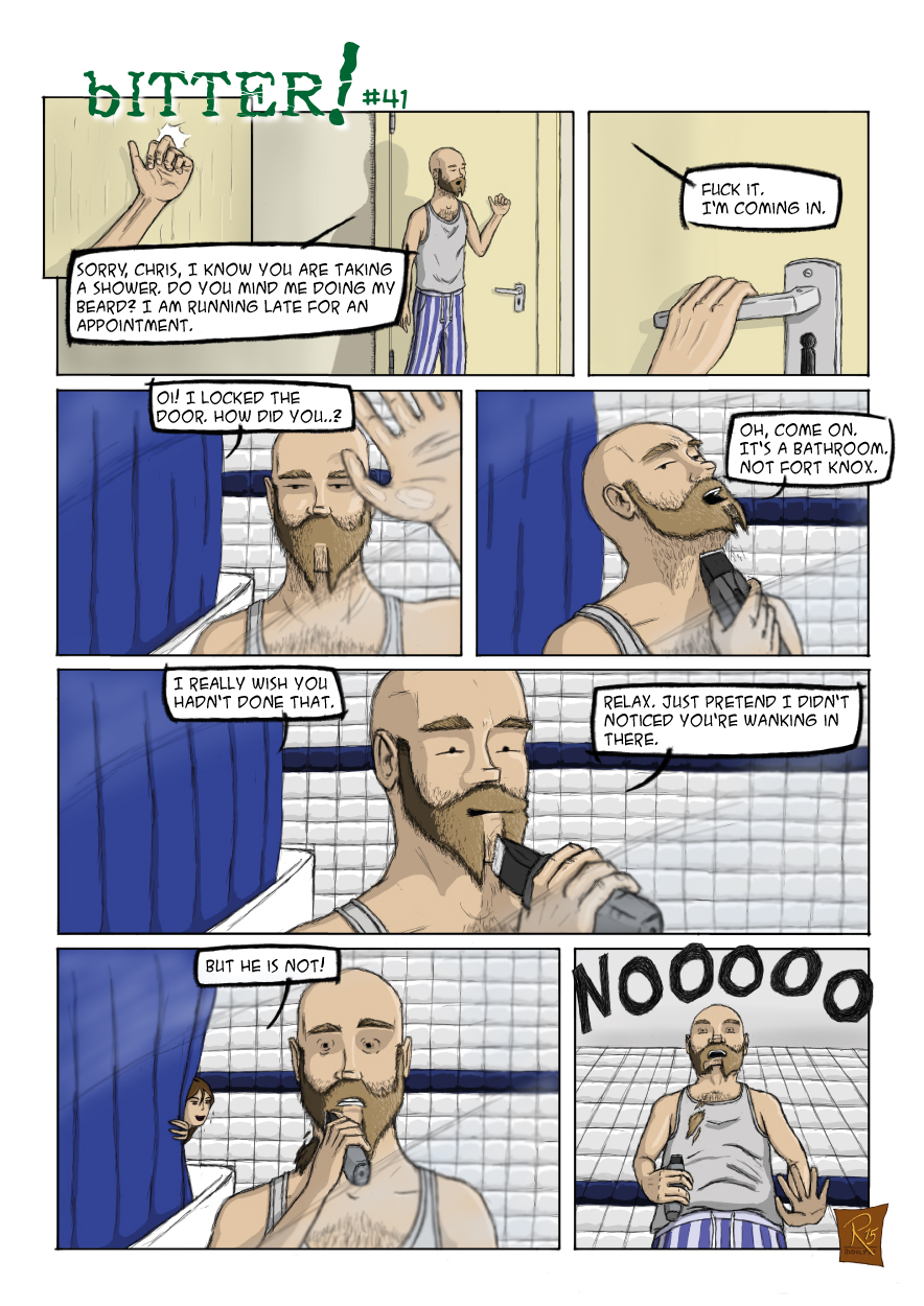 Another sitcom trope I am exploiting here. The almighty Deity of Flatmate Comedy decreed there has to be a bathroom scene, in which one catches the other with a woman in the shower.